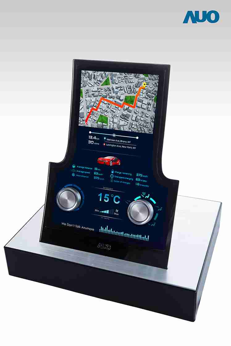 12.3 寸 Full HD LTPS 显示屏同样具备 1000 nits 高亮度,,,搭载内嵌式触控技术,,,整合驱动与触控 IC 于显示屏制程,,,,使显示屏厚度降低,,为中控台创造更多机构设计空间。。应用于抬头显示器的 3寸 LTPS 显示屏具有高穿透率、、1200:1 高对比度度,,,以及 297 PPI 高画素密度。。液晶最高可耐受到 110C 的高温 (TNI) 而不液化,,,,在阳光高温下维持优异稳定的显示效果。。