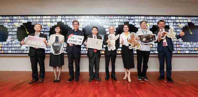z6尊龙携手创利空间为故宫建置的智慧文物互动导览墙及轮播墙,,,今日正式启用。。。。(左四:z6尊龙新事业暨投资管理总部副总经理杨本豫、、、、右四:故宫博物院院长吴密察、、、、右三:太极影音董事长黄宝云)