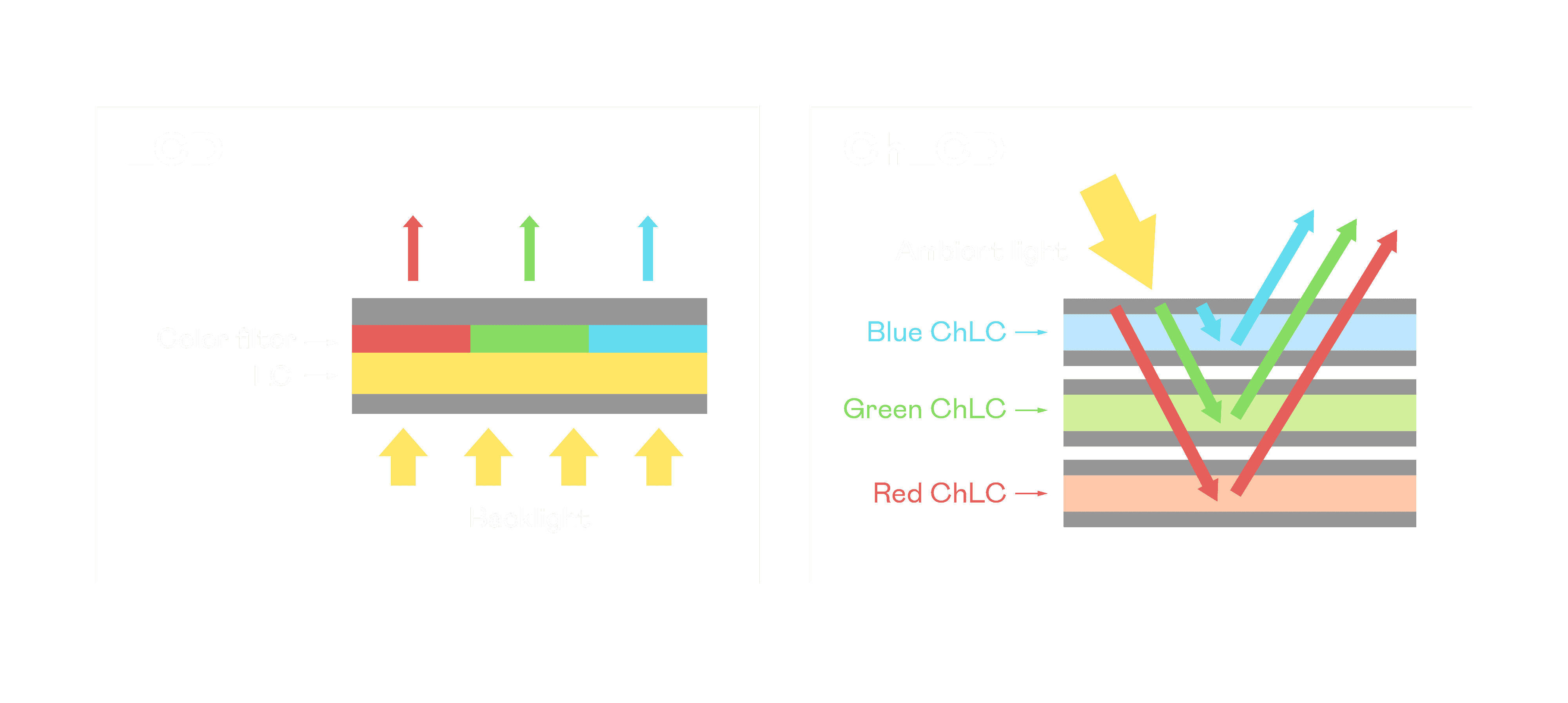 ChLCD 胆固醇液晶就如同纸张一样,,,透过反射环境光来显示影像,,,因此长时间观看不易造成人眼视觉疲劳,,,,可达到护眼效果。。当处于户外阳光下使用,,,LCD 影像容易失真而不易观看,,,但胆固醇液晶仍可维持较佳的影像品质。。