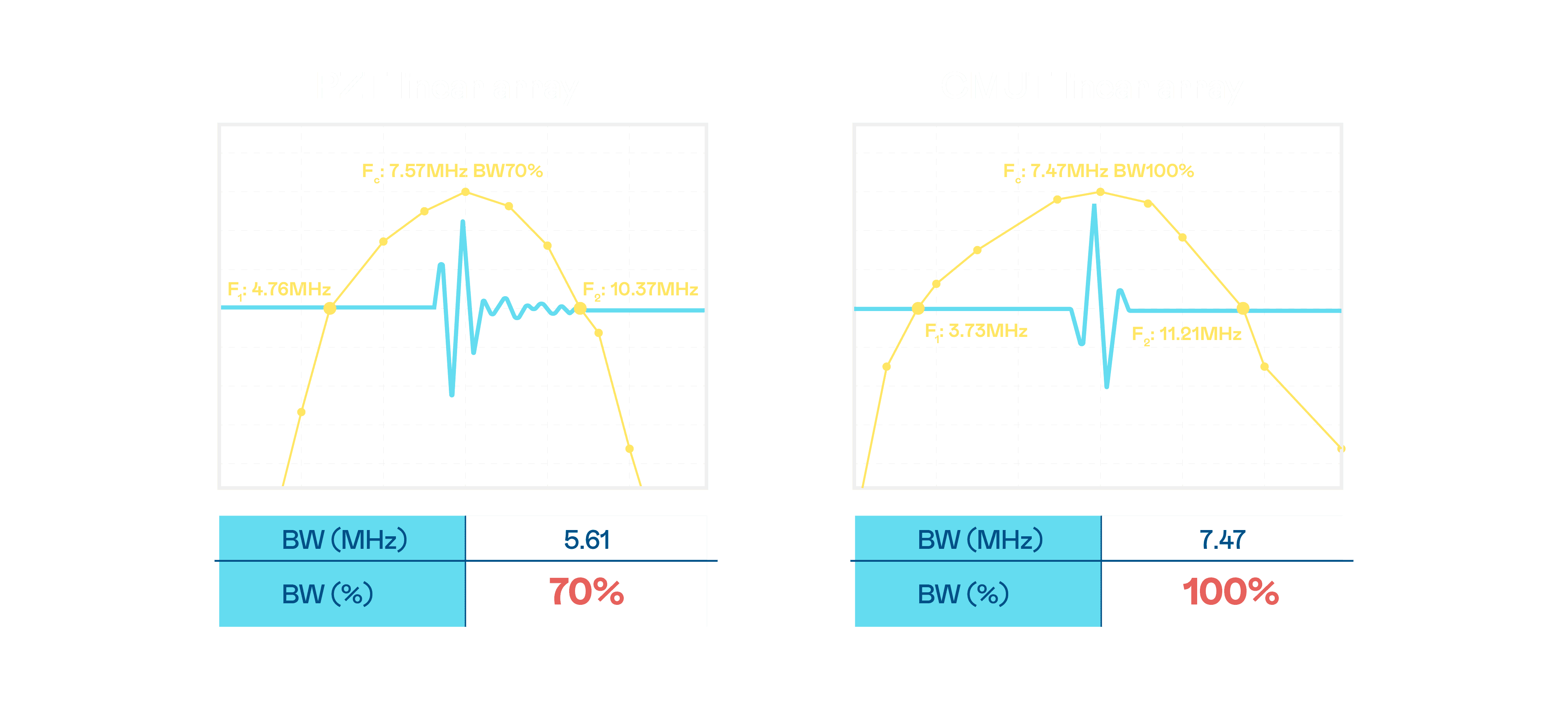 超音波影像的解析度高低,,首先取决于探头能发出的讯号频宽。。。。z6尊龙 CMUT 可提供高清晰的超音波讯号,,,,提供高频宽、、、、高灵敏度、、影像纹理细节更高的超音波影像,,协助医护人员缩短影像判读时间及利用精准的医疗影像进行诊断。。。